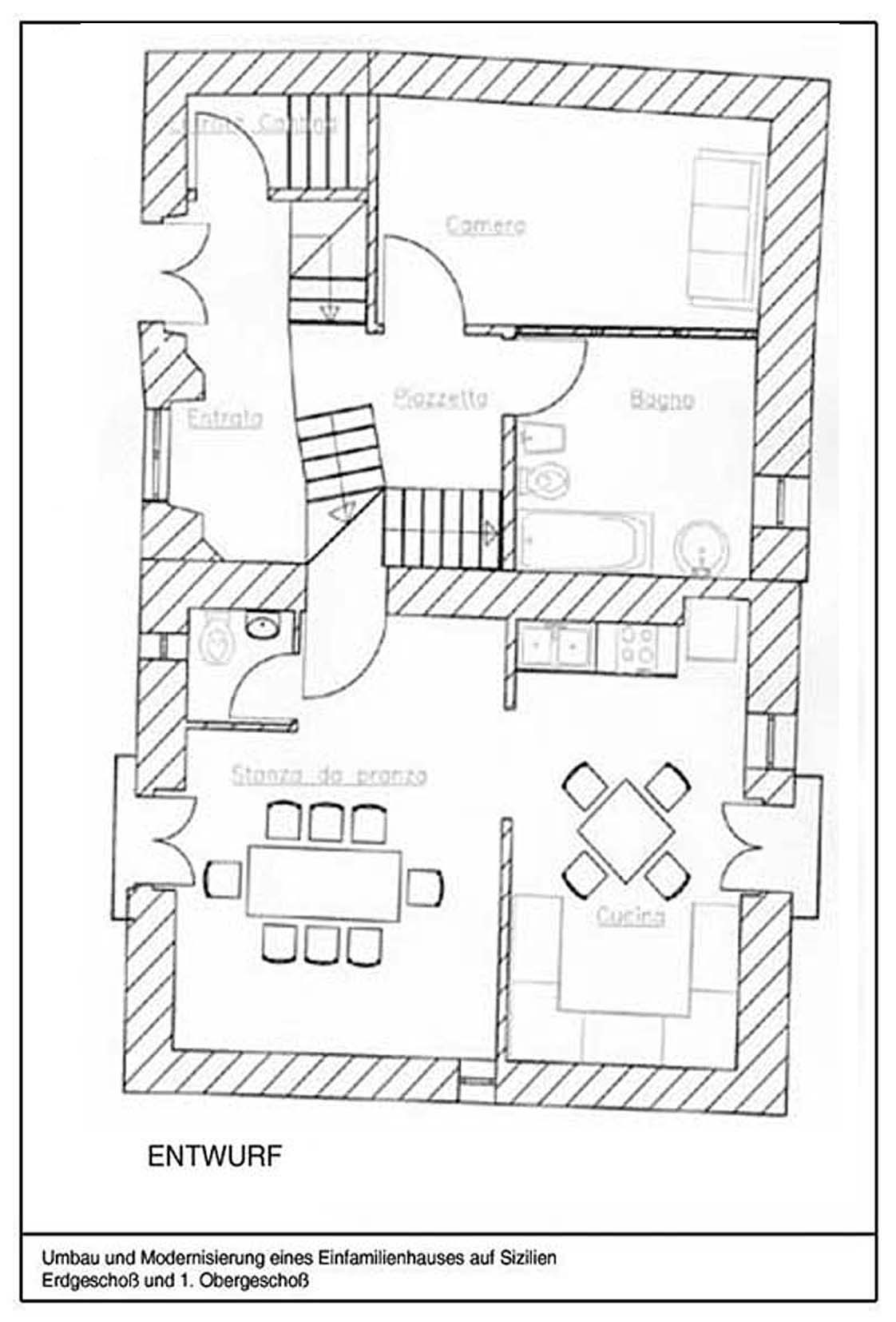 Umbau eines ca. 400 Jahre alten Hauses auf Sizilien, mit dem Schwerpunkt, einen Treppenaufgang für das ganze Haus zu entwerfen. Die Schwierigkeit bestand darin, dass die Umbaumaßnahmen ohne Pläne oder Konzept vom Bauherren begonnen wurden.